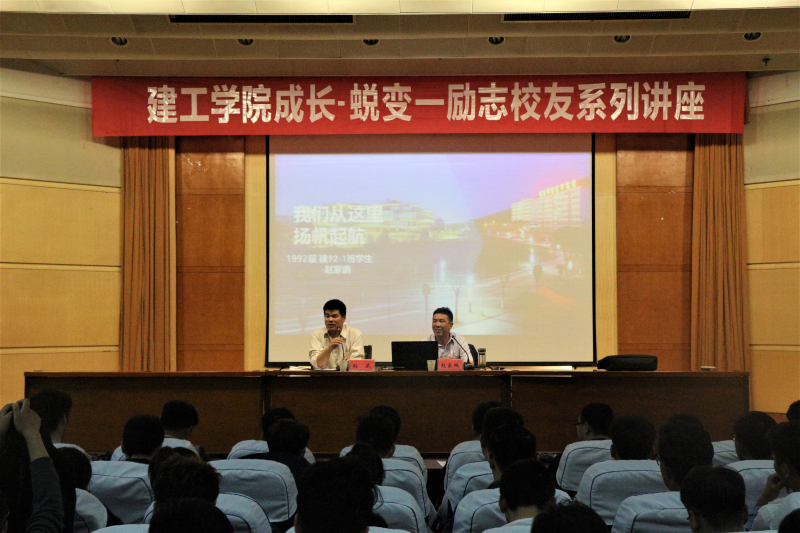 趙家鵬校友為學生們首先講述了自己當年在校的經歷以及畢業后的奮斗史,接著講述了自己在二十多年的工作中自己認為有用的經驗和感受,并重點講述了現在建筑企業對建筑類畢業生的人才要求,以及建筑類學子如何在校鍛煉自己的綜合素質。整個講座氣氛熱烈,在學長的鼓勵和引導下學子們情緒高漲,最后趙學長還給學子們觀看了施工現場新技術、新工藝的視頻,讓學子們受益匪淺。