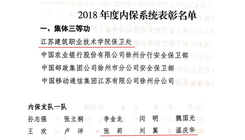 近日,徐州市公安局發(fā)布《關(guān)于表彰2018年度全市企事業(yè)單位內(nèi)保工作先進集體和先進個人的決定》(徐公局〔2019〕21號)授予我校保衛(wèi)處 “集體三等功”,我校保衛(wèi)處張莉,劉翼,溫慶華受到先進個人嘉獎。
