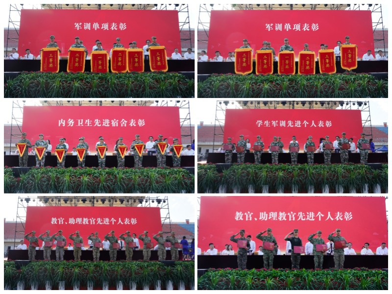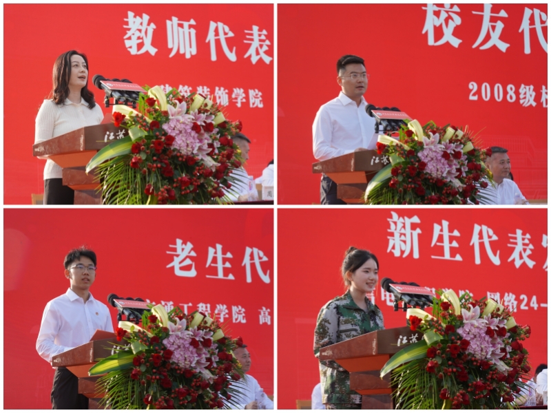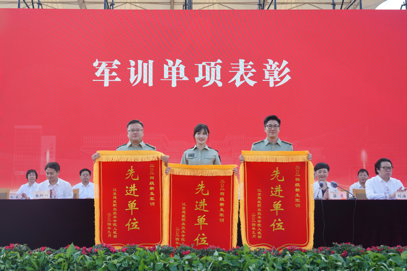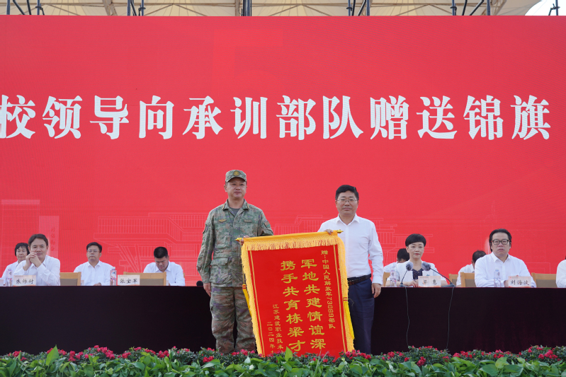 沈士德代表學校向承訓部隊贈送錦旗,朱作付宣讀了軍訓表彰文件。同時,大會還舉行了軍訓先進單位、軍訓單項比賽、內務衛生先進宿舍、先進個人、優秀教官頒獎儀式。在校生代表交通工程學院高鐵23-1班呂琪明,新生代表信電工程學院網絡24-5班馮茜雅,教師代表建筑裝飾學院陸文鶯,校友代表江蘇紅日酒業有限公司總經理姜東明先后上臺發言。