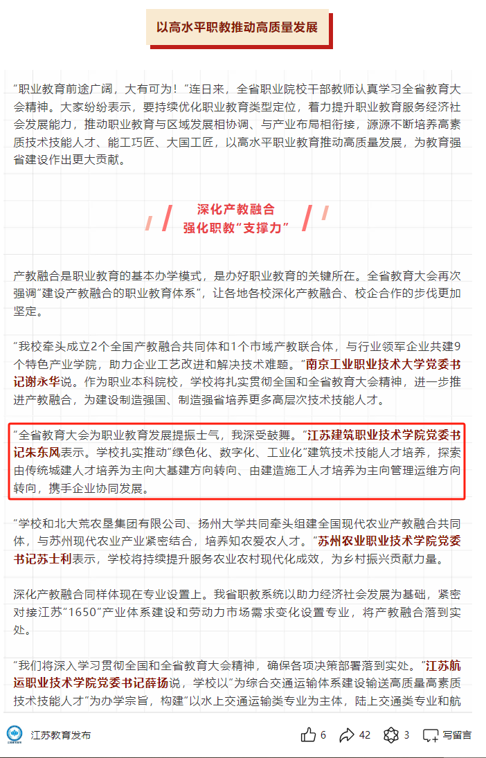 “全省教育大會為職業教育發展提振士氣,我深受鼓舞。”江蘇建筑職業技術學院黨委書記朱東風表示。學校扎實推動“綠色化、數字化、工業化”建筑技術技能人才培養,探索由傳統城建人才培養為主向大基建方向轉向、由建造施工人才培養為主向管理運維方向轉向,攜手企業協同發展。