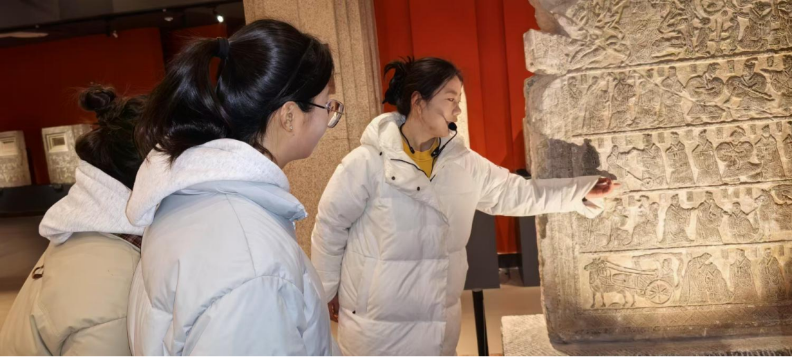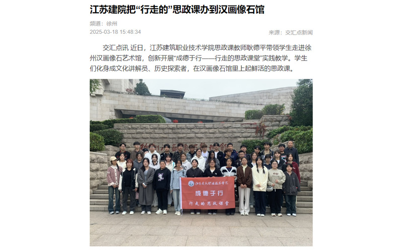 交匯點訊 近日,江蘇建筑職業技術學院思政課教師耿德平帶領學生走進徐州漢畫像石藝術館,創新開展“成德于行——行走的思政課堂”實踐教學。學生們化身成文化講解員、歷史探索者,在漢畫像石館里上起鮮活的思政課。