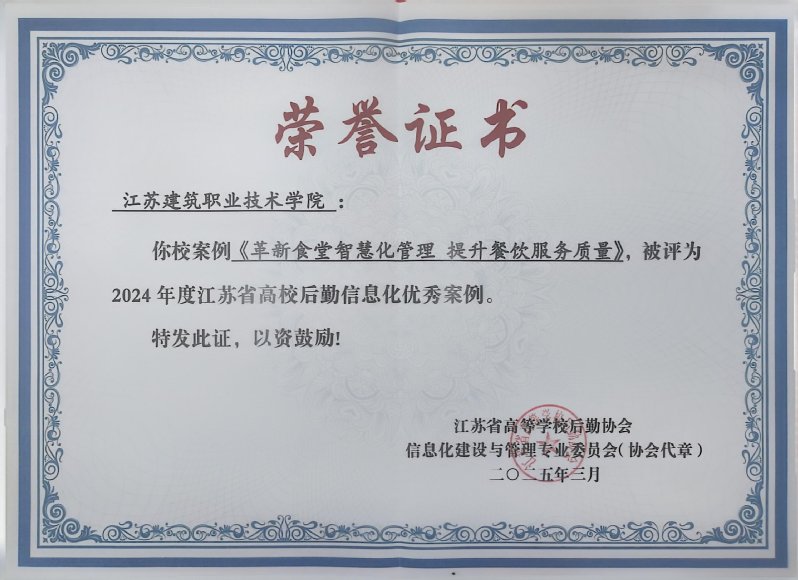 近日,江蘇省第六屆高校后勤互聯(lián)網(wǎng)大會(huì)暨信息化建設(shè)與管理專業(yè)委員會(huì)2024年會(huì)在江蘇科技大學(xué)召開,我校報(bào)送的案例《革新食堂智慧化管理,提升餐飲服務(wù)質(zhì)量》被評(píng)為2024年度江蘇省高校后勤信息化優(yōu)秀案例。