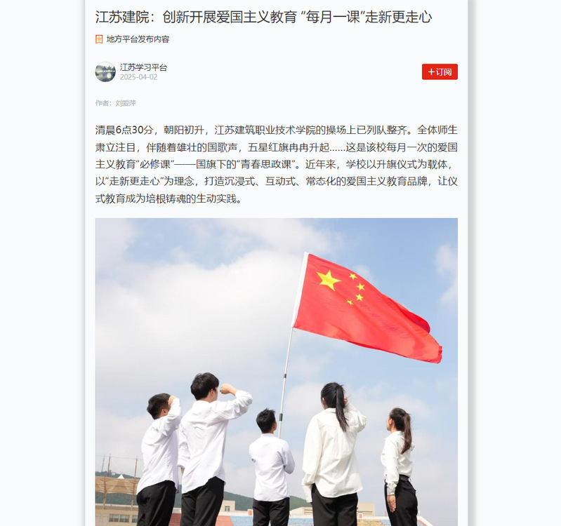 清晨6點30分,朝陽初升,江蘇建筑職業技術學院的操場上已列隊整齊。全體師生肅立注目,伴隨著雄壯的國歌聲,五星紅旗冉冉升起……這是該校每月一次的愛國主義教育“必修課”——國旗下的“青春思政課”。近年來,學校以升旗儀式為載體,以“走新更走心”為理念,打造沉浸式、互動式、常態化的愛國主義教育品牌,讓儀式教育成為培根鑄魂的生動實踐。