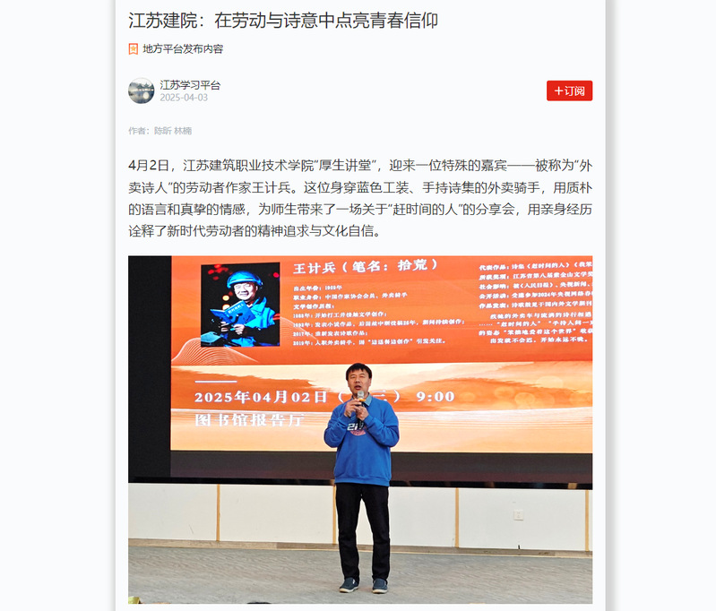 4月2日,江蘇建筑職業技術學院“厚生講堂”,迎來一位特殊的嘉賓——被稱為“外賣詩人”的勞動者作家王計兵。這位身穿藍色工裝、手持詩集的外賣騎手,用質樸的語言和真摯的情感,為師生帶來了一場關于“趕時間的人”的分享會,用親身經歷詮釋了新時代勞動者的精神追求與文化自信。