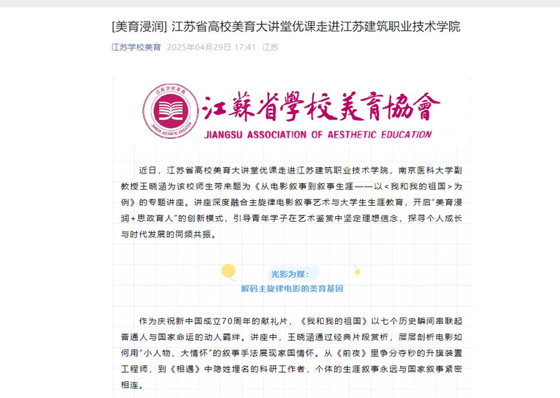 近日,江蘇省高校美育大講堂優課走進江蘇建筑職業技術學院,南京醫科大學副教授王曉涵為該校師生帶來題為《從電影敘事到敘事生涯——以<我和我的祖國>為例》的專題講座。講座深度融合主旋律電影敘事藝術與大學生生涯教育,開啟“美育浸潤+思政育人”的創新模式,引導青年學子在藝術鑒賞中堅定理想信念,探尋個人成長與時代發展的同頻共振。