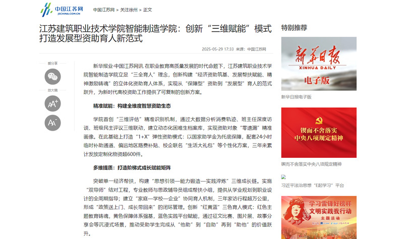 新華報業(yè)·中國江蘇網(wǎng)訊 在職業(yè)教育高質(zhì)量發(fā)展的時代命題下,江蘇建筑職業(yè)技術(shù)學院智能制造學院立足“三全育人”理念,創(chuàng)新構(gòu)建“經(jīng)濟資助筑基、發(fā)展幫扶賦能、精神激勵鑄魂”的立體化資助育人體系,實現(xiàn)從“保障型”資助到“發(fā)展型”育人的范式躍升,為新時代高校資助工作提供了可復制的創(chuàng)新方案。