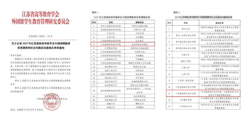 近日,江蘇省高教學(xué)會外國留學(xué)生教育管理研究委員會公布了2025年江蘇高校來華留學(xué)生中國國情教育優(yōu)秀課程和社會實(shí)踐活動基地評選結(jié)果。我校連續(xù)兩年入選,其中國際交流學(xué)院教師王靜主持的課程《論語用典雙語賞析》被評為“2025年江蘇高校來華留學(xué)生中國國情教育優(yōu)秀課程”,公共基礎(chǔ)學(xué)院教師韓冰雪申報(bào)的“禮射展覽館”來華留學(xué)生中國國情教育基地被評為“2025年江蘇高校來華留學(xué)生中國國情教育社會實(shí)踐活動基地”。