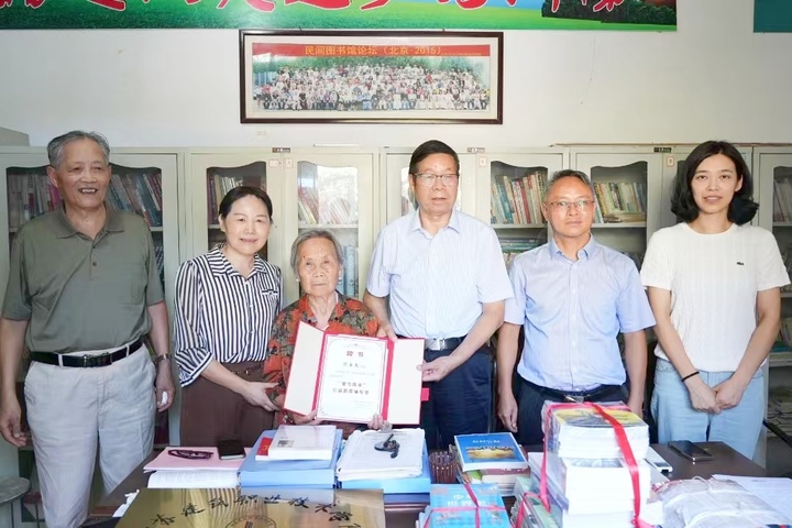 “砸鍋賣鐵也要讓孩子們讀書,要把他們培養起來,成為對國家對社會有用的人。”在陳樓鎮大顧村陳玉文讀書點,九旬老人陳玉文向師生介紹了讀書點創辦初衷及相關情況,老人家數十載如一日守護農家書屋、推廣鄉村閱讀的事跡打動了在場師生,學院特別為其頒發了“‘愛與傳承’公益教育輔導員”聘書。經過前期調研,立足鄉村青少年需求,師生精心挑選并向書屋捐贈了210余冊圖書及30余套文具。志愿者們對現有圖書進行分類、整理、上架,建立圖書信息臺賬,同時優化圖書借閱流程,更新了書屋的照明、空調設施,營造出更加溫馨舒適的閱讀環境。