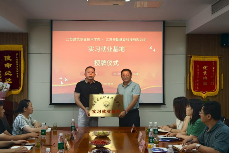 隨后,蔣兆峰與王雪峰共同為“江蘇建筑職業(yè)技術學院實習就業(yè)基地”揭牌。