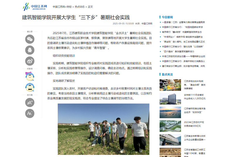 2025年7月,江蘇建筑職業(yè)技術(shù)學(xué)院建筑智能學(xué)院“金衣沃土”暑期社會(huì)實(shí)踐團(tuán)隊(duì)先后赴江蘇省徐州市銅山區(qū)茅村鎮(zhèn)、柳泉鎮(zhèn)、棠張鎮(zhèn)等地開展大學(xué)生暑期社會(huì)實(shí)踐。目的是調(diào)研土壤污染退化和土壤種植連作障礙等問題,幫助農(nóng)戶改善設(shè)施栽培問題,提升農(nóng)民土壤修復(fù)意識(shí),為鄉(xiāng)村振興貢獻(xiàn)“青年智慧”。